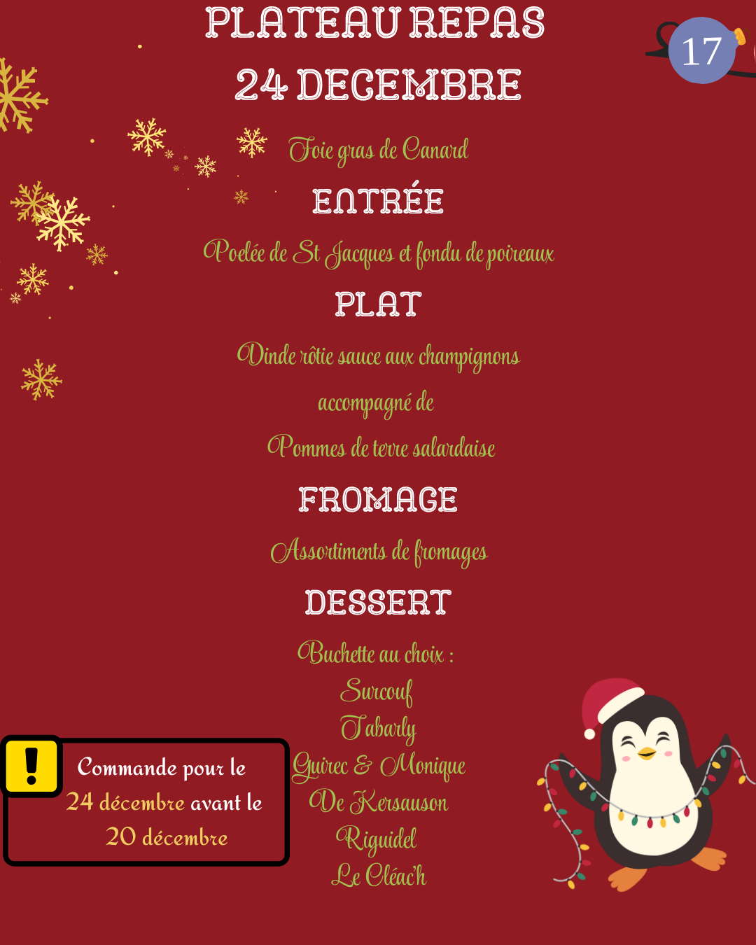 🎅 Pour les fêtes de fin d’année, le traiteur Ty Poz à Pontivy et Guerlédan vous propose ses plateaux repas de Noël et du Nouvel An.